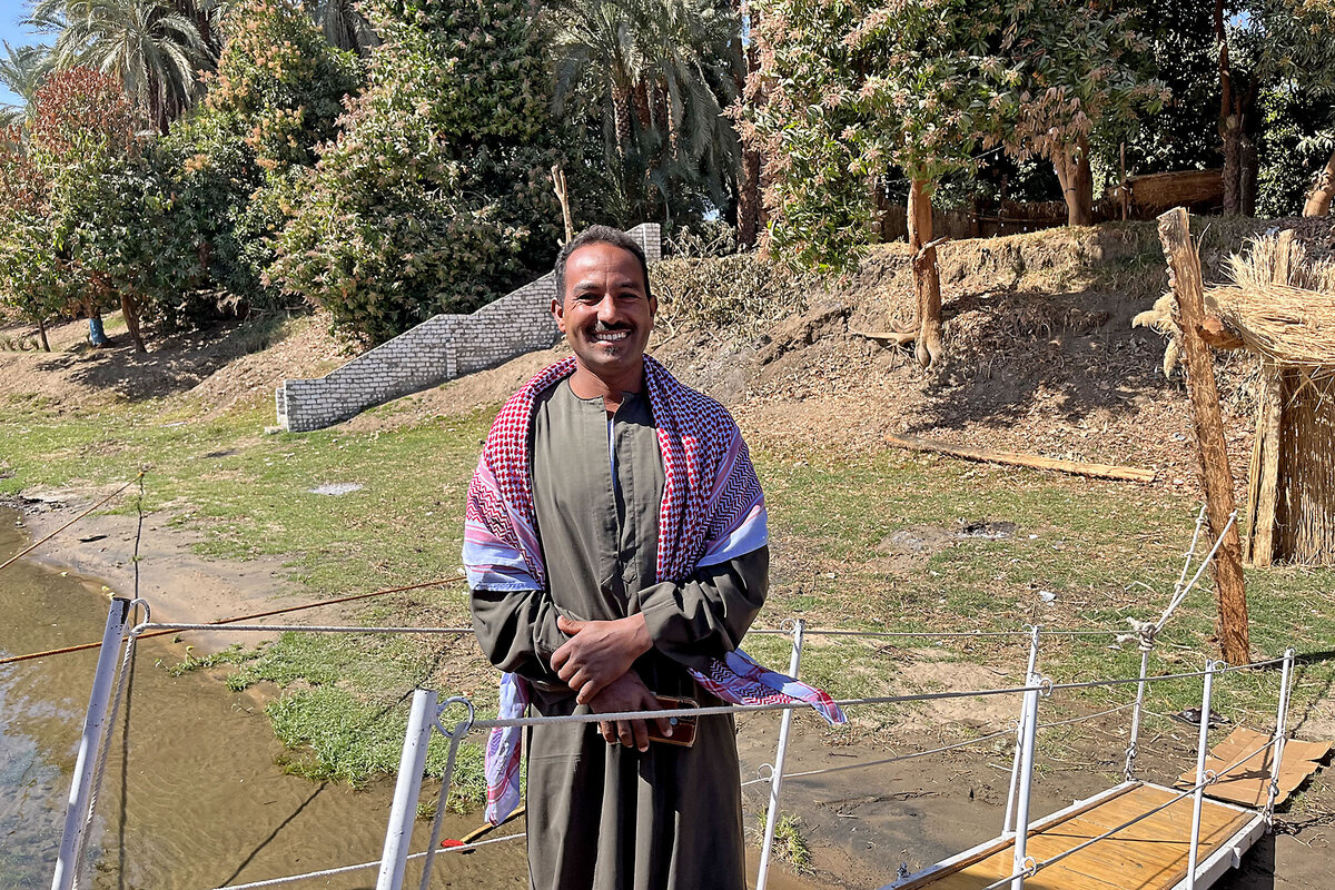 Our first glimpse of the low-lying island, roughly 500 miles south of Cairo, is of a fisherman balancing skillfully atop his rowboat in the bulrushes. Nearby, Sayed Hassan waits for us at the bottom of the gangplank, smiling broadly in his long green robe – a galabia. He leads us along narrow raised paths through groves of mangoes, dates, and bananas. He stops to explain how they reproduce and are harvested, and that Egypt is the world’s largest producer of dates. A pleasantly warm sun filters through the fronds.