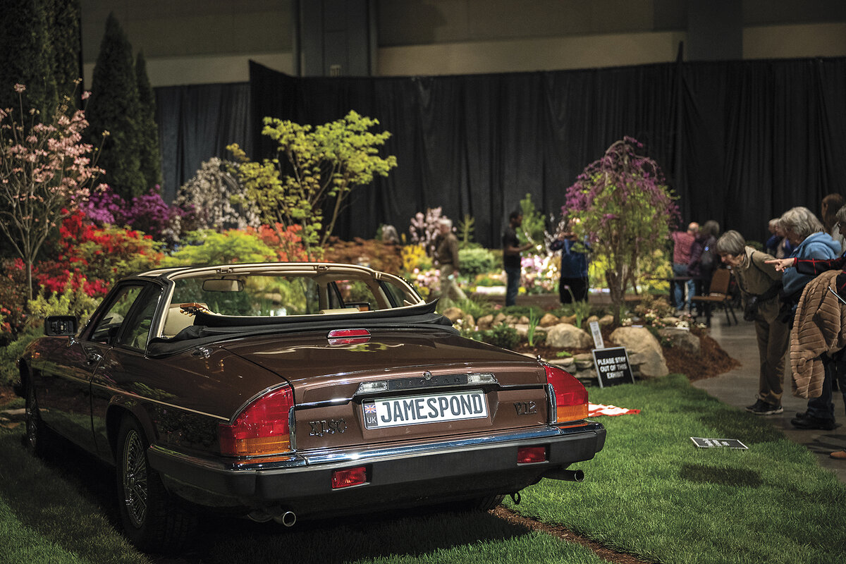 Rob Townsend, who owns an aquascaping company, won his eighth best-of-show trophy among the landscape exhibitions. His mock country garden includes fluttery azaleas, graceful Japanese maple trees, a fountain, and his father’s 1986 Jaguar.