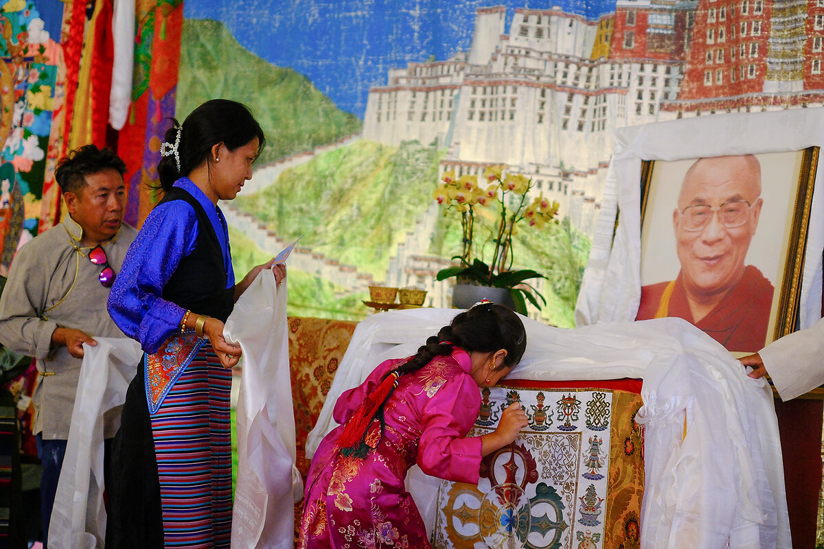 Women wear turquoise jewelry reserved for special occasions, and families drape white khatas, a ceremonial scarf, around a portrait of the Dalai Lama. Above it, a cloth tapestry depicting Potala Palace – the traditional winter home of the Dalai Lamas in Tibet – flutters in the air conditioning.