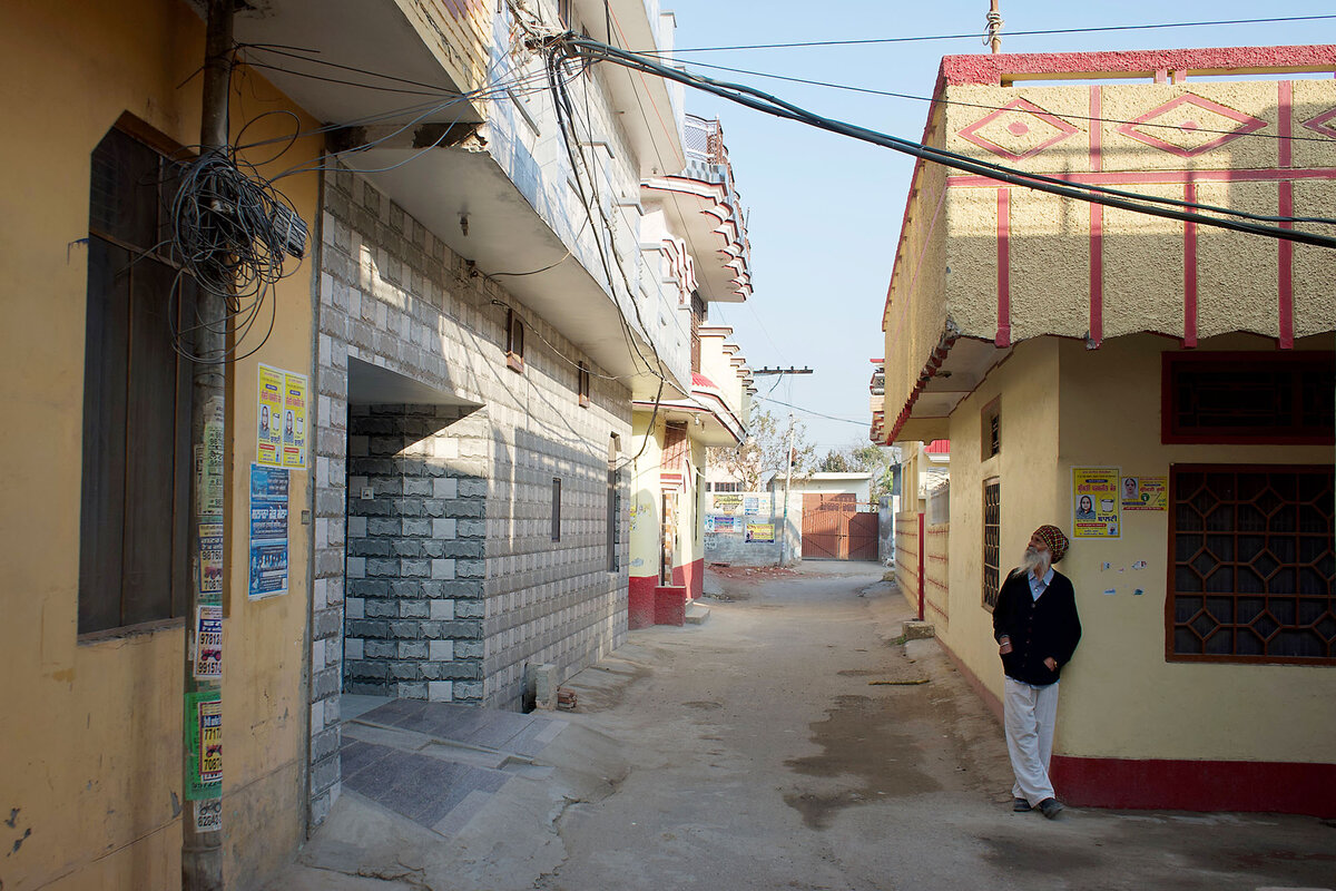 A narrow road through blooming yellow mustard fields and wheat paddies reveals a cluster of terraced double-story houses, their bright white facades contrasting with colorful compound walls. But behind their padlocked metal gates, there is mostly silence.