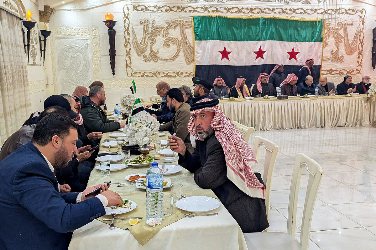 With HTS guards outside, Christian, Alawite, and Sunni Muslim figures gathered in a restaurant and broke bread, sharing platters of lamb and rice.