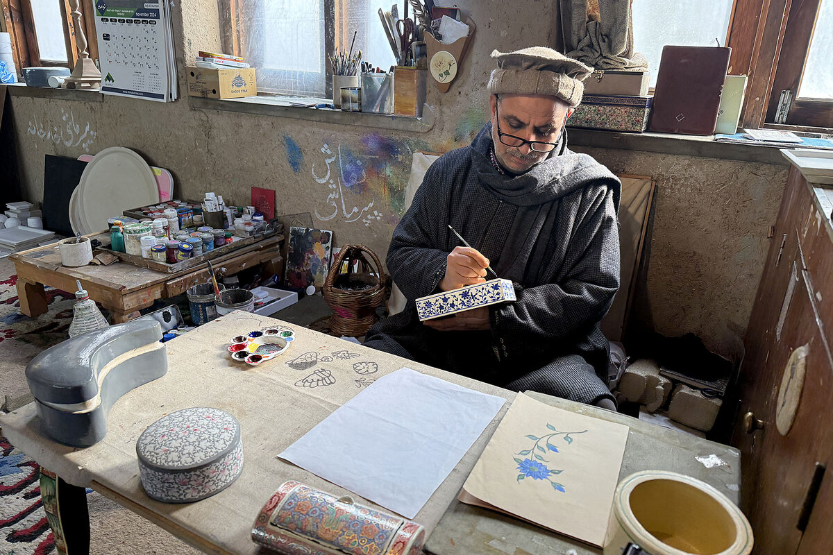 From his home in a historic neighborhood of Srinagar, Syed Maqbool Rizvi paints intricate floral patterns on a decorative box. His day started at 9 a.m. and will end at midnight. Despite having a loyal customer base that he communicates with via WhatsApp, he only earns the equivalent of about $5 for an entire day’s labor.