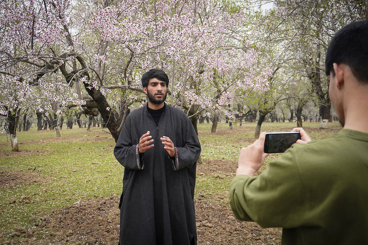Touqeer Ashraf and his younger brother, Tasaduq, are using a smartphone to make a short video of almond trees. They capture the smallest details, including the contrast between the blossoms’ white and light-pink petals, and how the branches dance in the gentle breeze.