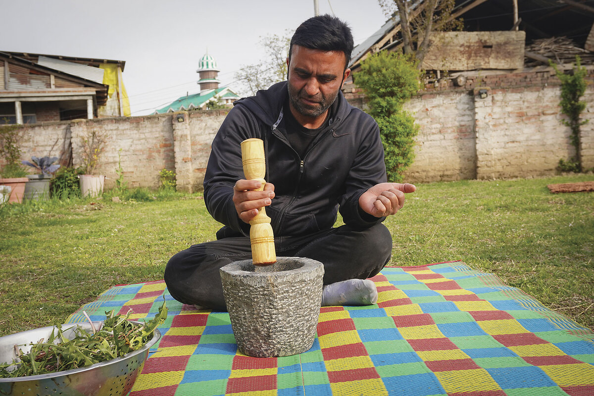 Speaking in Kashmiri, he explains the importance of dandelions in local tradition and how they can be cleaned, sun-dried, and stored. The flowers, he says, can be used to make tea or chocolates, while the nutritious leaves can be cooked or eaten raw in salads.