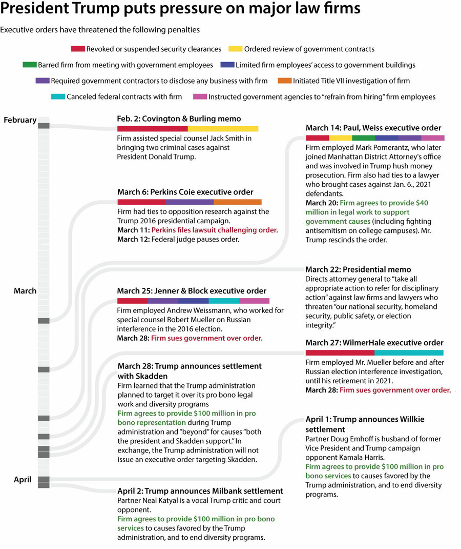 In late February, Mr. Trump issued a memo targeting Covington & Burling LLP. Noting that the firm had helped former special counsel Jack Smith, who brought two criminal prosecutions against the president, he instructed senior federal officials to revoke security clearances for the firm and to evaluate government contracts with Covington.