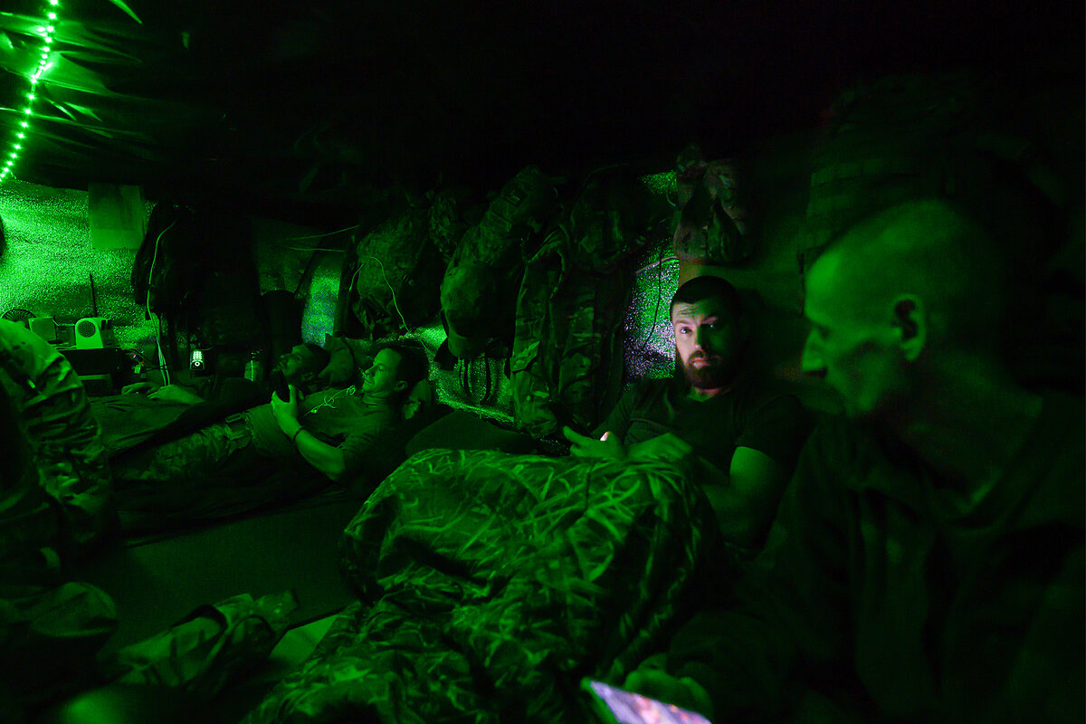 It is just after 3:30 a.m., and a Ukrainian artillery team’s half-dozen men are asleep in a cramped underground dugout, the dirt walls fortified by logs and the space dimly lit by a single string of green fairy lights.